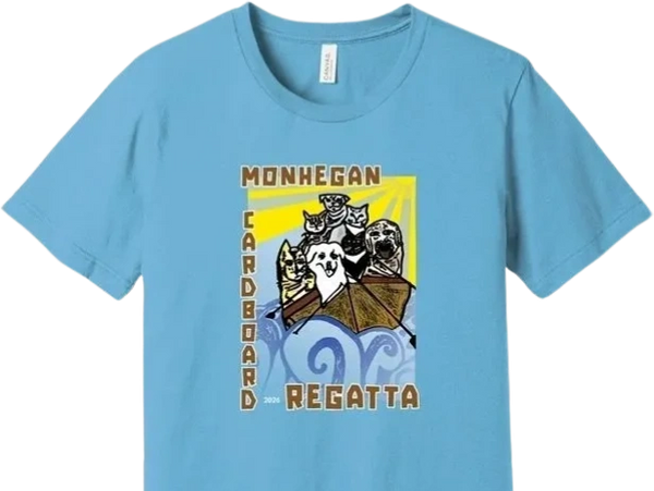 The 2026 Monhegan Cardboard Regatta will take place August 6th. Purchase this year's t-shirt (pictured here) on the island this summer!